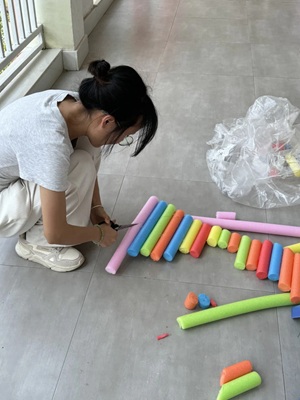 活动前期,师范学院师生团队秉持"环保、创新、实用"理念,利用废旧纸箱、塑料瓶、卡纸等日常材料,结合学前教育专业特色,精心设计制作环创教具。从绘制设计图稿到裁剪塑封,从色彩搭配到立体造型,每一件作品都凝聚着师生的巧思与匠心。