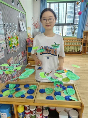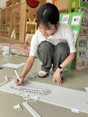 在幼儿园实践活动中,学生们与园所教师紧密配合,围绕"六一""端午"双节主题开展多项环创设计与教学辅助工作。他们运用超轻黏土、扭扭棒等材料打造了"端午龙舟""黏土花园""彩虹纸板"等立体展板,将传统文化与儿童审美巧妙融合;同时制作"数字练习卡""区角规则牌""家校联系簿"等实用教具,助力课堂教学趣味化、游戏化。