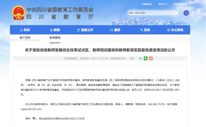近日,四川省教育厅公示了“首批省级教师发展综合改革试点区、教师培训基地和教师教育实践基地遴选情况”,我校成功入选四川省“首批省级教师教育实践基地”名单。