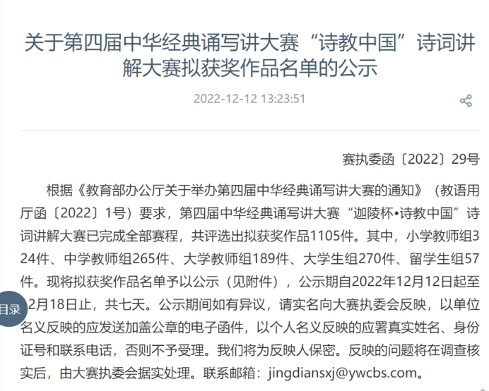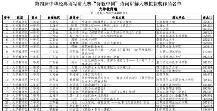 12月12日,第四届中华经典诵写讲大赛“诗教中国”诗词讲解大赛拟获奖作品名单进行公示,我校教师林媛的作品《定风波》荣获大学教师组一等奖!